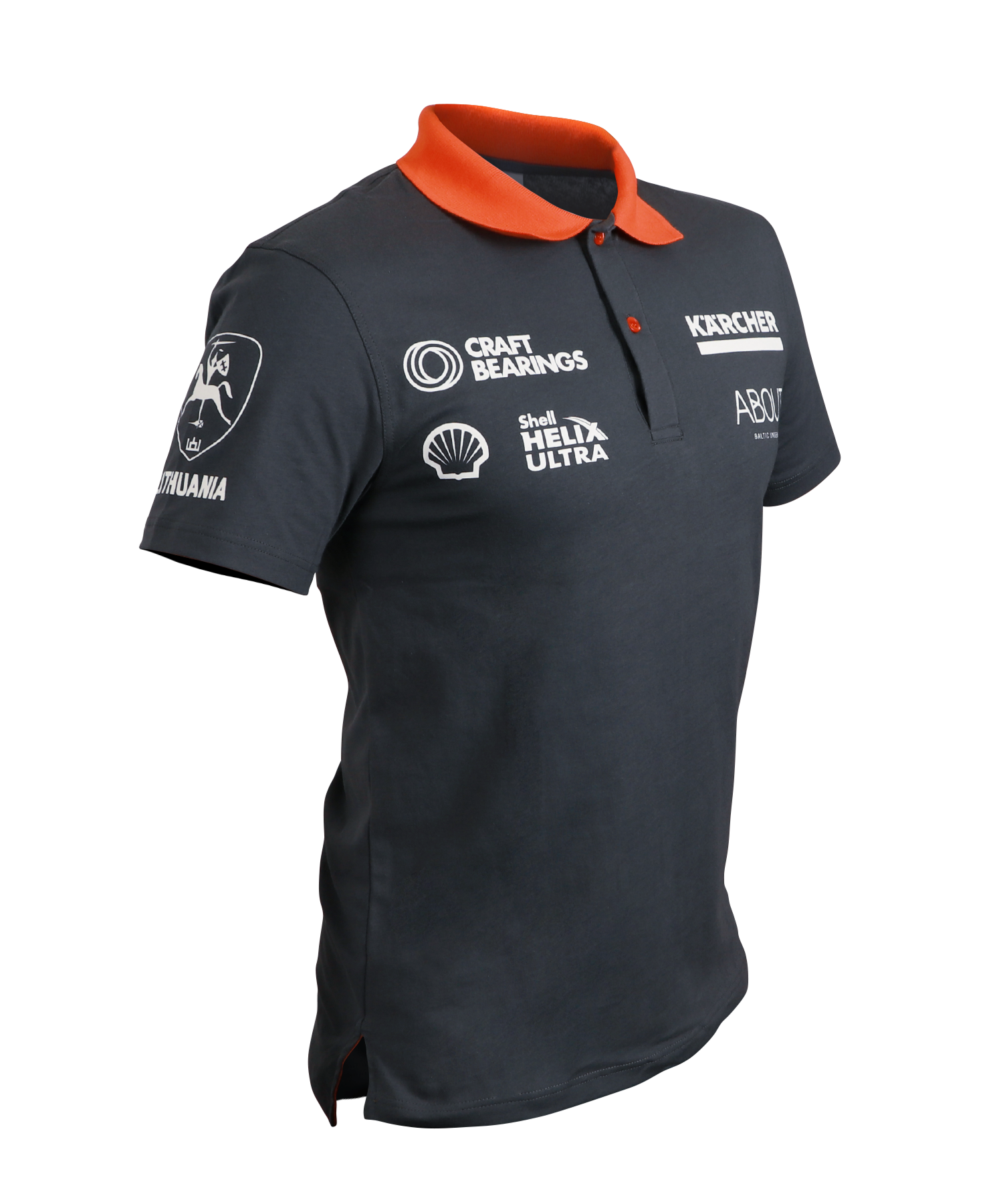 Pilkos spalvos Antano Juknevičiaus Dakaro ralio komandos polo stiliaus marškinėliai oranžine apykakle.